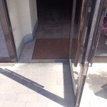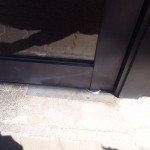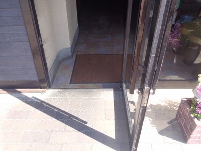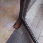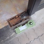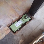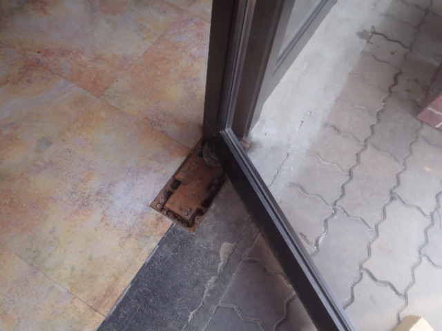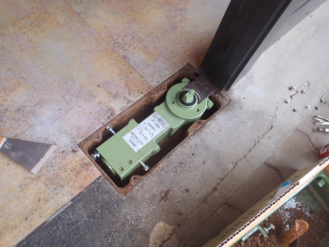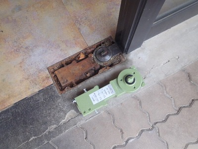 到着してみるとフロアヒンジの中身がひどく錆びており、固まった状態で無理やり開け閉めしたためにドアが歪んだ状態でした。