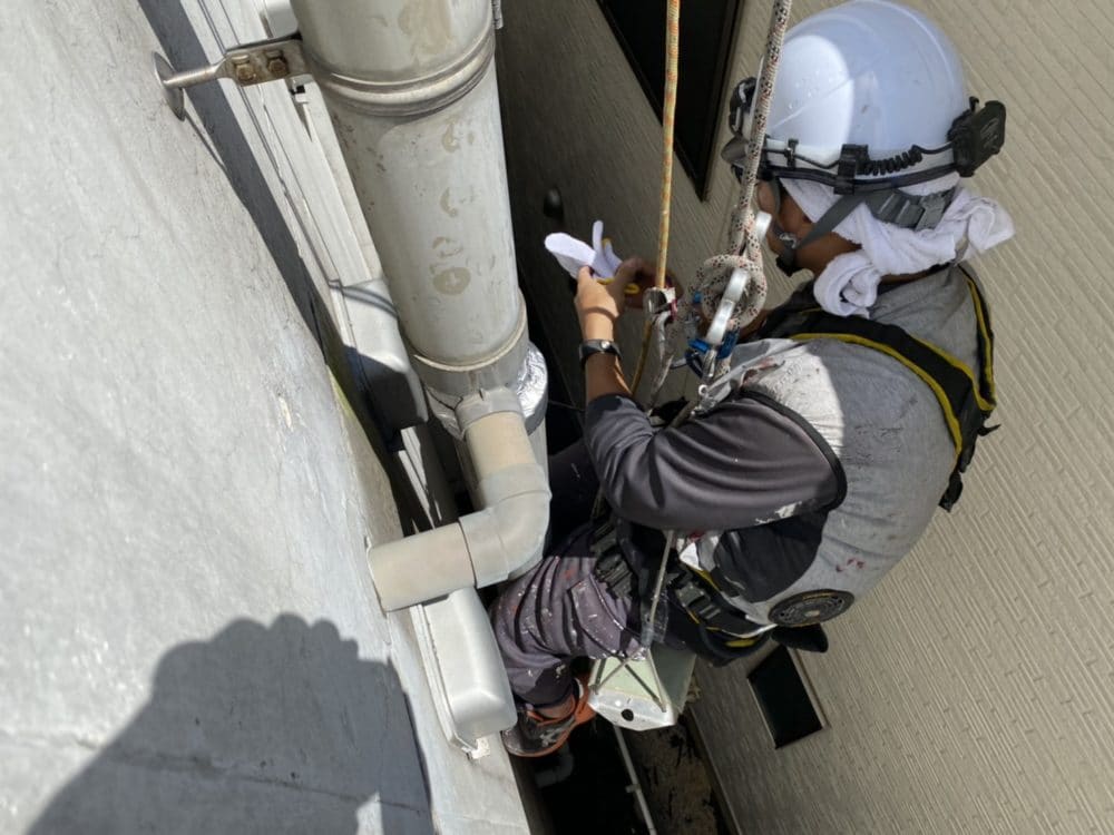 真新しい雨樋にするには、足場も必要となり、時間と費用を費やすことになるため、今回は屋上からのロープ作業にて実施を致しました。