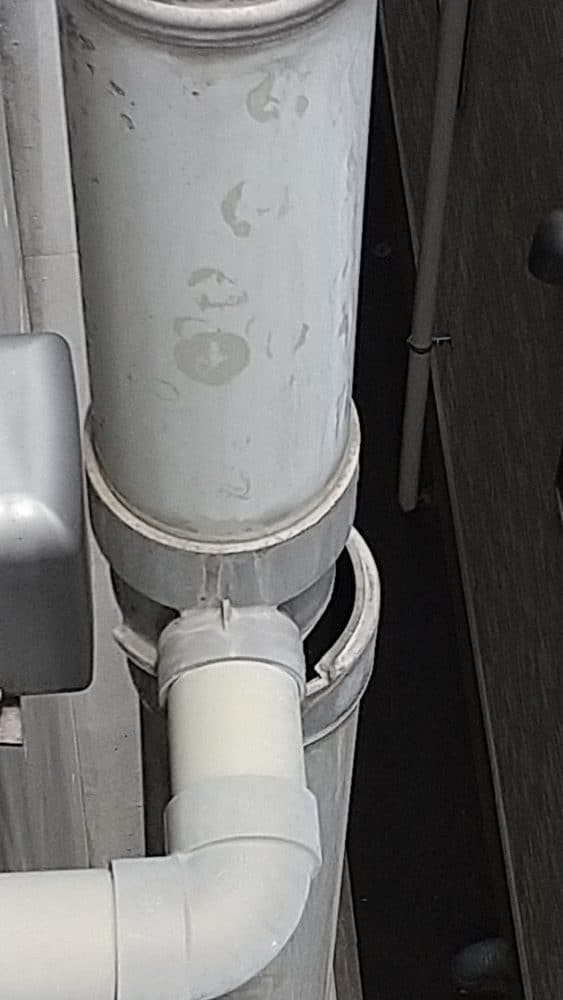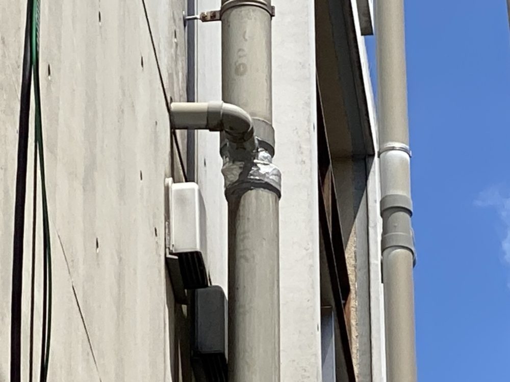 今回は、練馬区にあるマンションで、雨樋の継ぎ目部分の破損があり、雨水が管を通らず途中で落下してしまう状況でした。