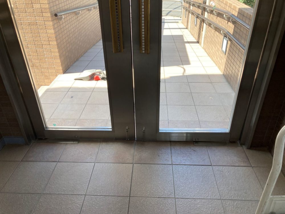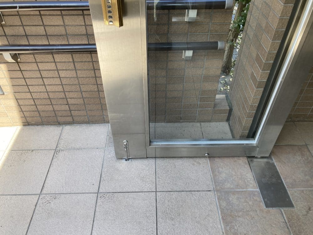 こちらの物件のエントランス扉は強風が吹くと、アプローチの手啜りにぶつかり、ガラスが割れてしまうという事象が再三発生しておりました。