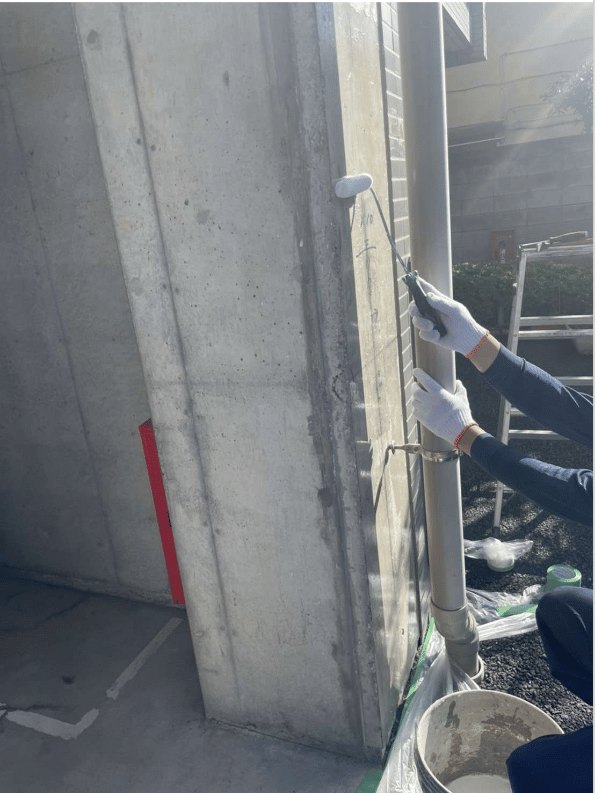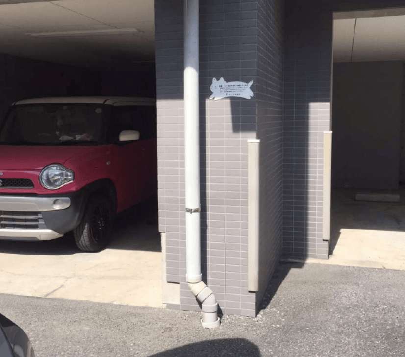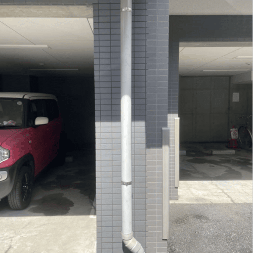 つい先日、雨どい裏側のタイルが一部剥落してしまい、他も剥がれ落ちてしまいそうな状況でしたので緊急工事です。