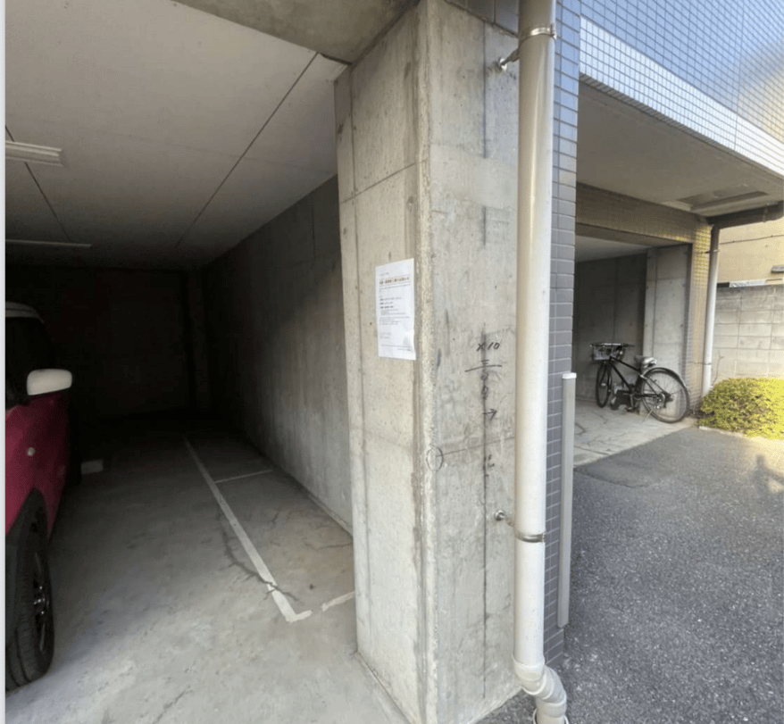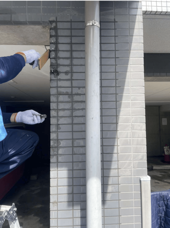 駐輪場・駐車場スペースの外壁タイルなので居住者の方や車両に被害が出ないよう他タイル面を確認しましたが、幸いこの範囲だけの浮きでしたので、部分補修を行うことになりました。