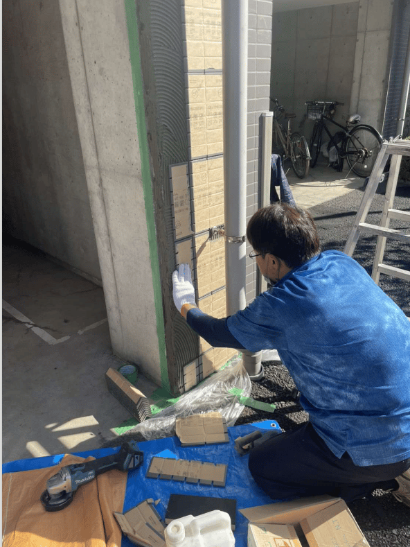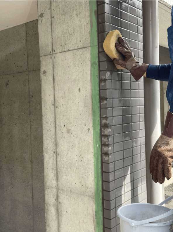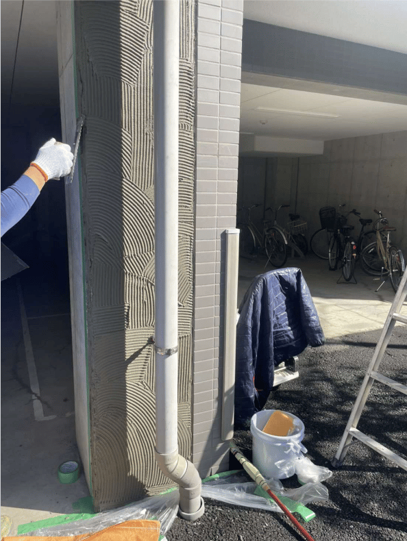 目荒らしという工程で表面を粗くして、接着用モルタルを塗ってタイルを貼り付けます。