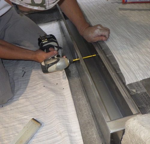 排水溝の新設にあたって、設置場所の寸法を測り、そのサイズに合わせてステンレス枠を製作しました。