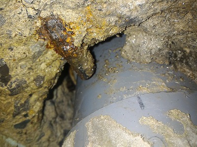 この配管は塩ビ素材の上から、繊維を混入したコンクリートで固めた配管です。