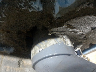 そのまま水の流れを辿って確認していくと、上の排水管を伝ってきているの事がわかりました。