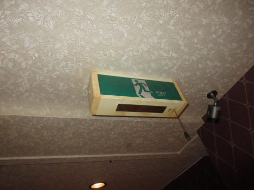 誘導灯交換作業後。電球はLEDになり、サイズもかなり小さくなっています。リニューアルプレートを設置して、空いていた穴を隠します。