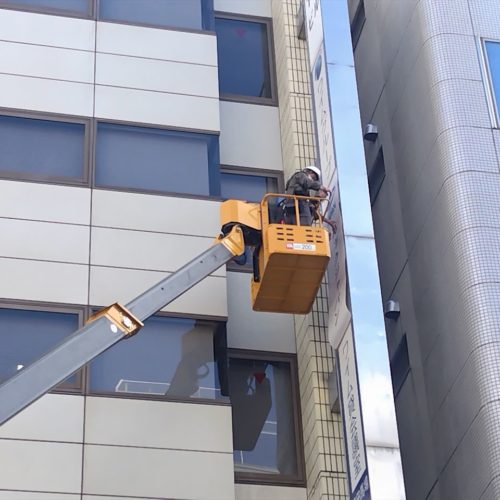 当日の道路専有許可もちゃんと取得して、高所作業車にて作業実施です。