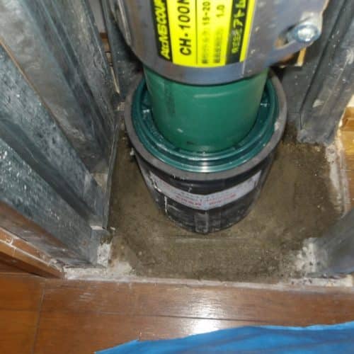 まずは上階の壁面を開口して作業スペースを確保し、配管が貫通する床のモルタルを斫ります。